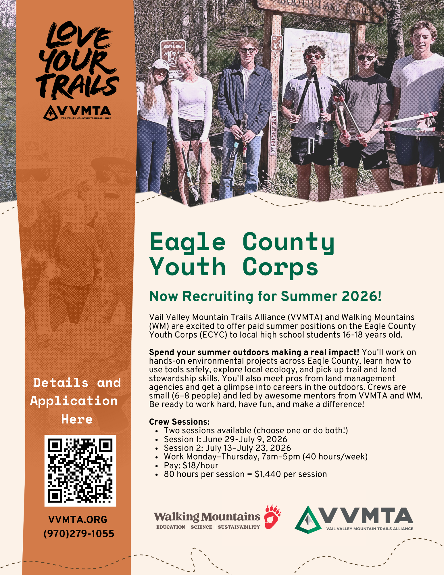 The VVMTA and Walking Mountains (WM) are excited to offer paid summer positions on the Eagle County Youth Corps (ECYC) to local high school young adults. Crew members working on the ECYC will work on environmental restoration and stewardship projects on public lands across Eagle County. Crew members will learn about the environmental impacts of the projects they are completing, safe tool use, land and trails etiquette, and ecology-based lessons. Crew members will also meet and learn about career opportunities within a variety of land management agencies. This internship demands a strong work ethic to be successful in this fast paced and dynamic work environment. ECYC crews are comprised of six to eight crew members and adult leaders from VVMTA and WM.