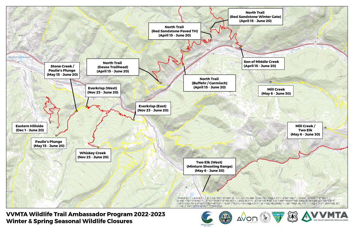 On the North side of I-70, deer and elk are migrating from the sunny, south facing habitats they have called home for the winter into the more temperate and forested areas above West Vail. These herds more than likely spent a majority of their winter in areas above the Berry Creek trail system and West Avon Preserve. As they move into Vail in the spring and early summer, trail closures on the North Trail, Buffehr Creek, and Son of Middle Creek go into effect through June 20.