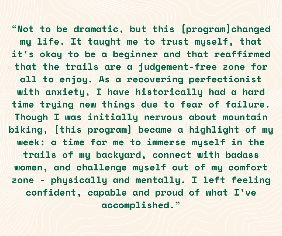 - Resources & Education: Support to increase the resources available to our community to understand how, where, and why they can get outside on the trails. Imagine not knowing you have a trail in your backyard that is free and yours to use. We want to make sure our community knows this and feels welcome to use it.