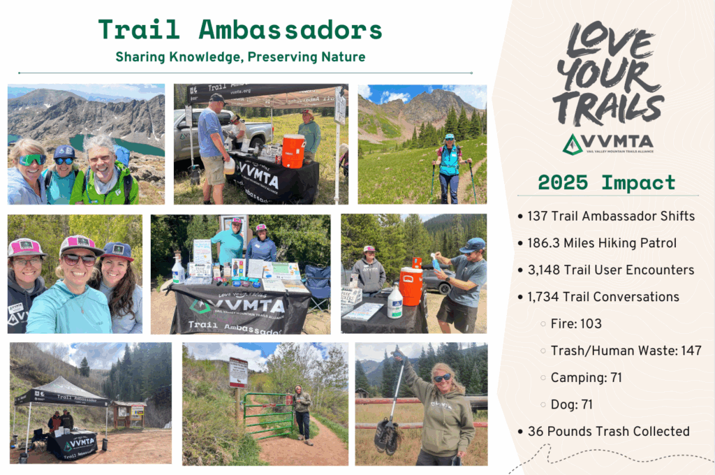 Finally, thank you to everyone who stopped to chat, asked a question, packed out a little extra trash, or made a promise to Respect the Vail Valley this season. Because of you — our ambassadors, volunteers, and trail users — we’re building a culture of stewardship, one step, one conversation, and one trail at a time.